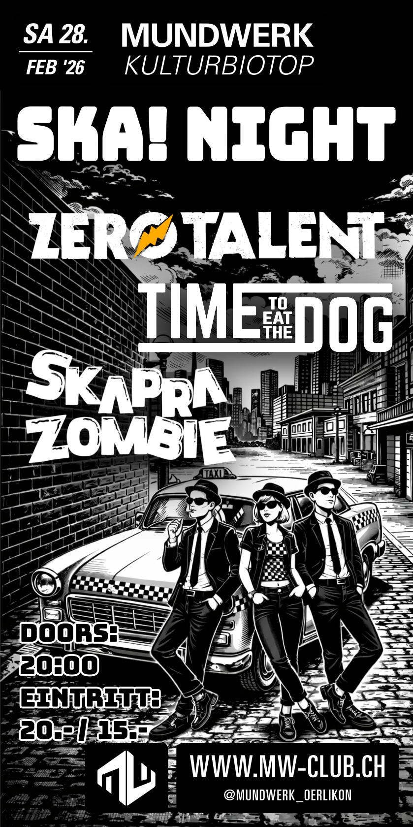 Rude girls and boys unite! Skapra Zombie liefern sechsköpfigen Ska-Punk aus Zürich. Offbeat, ordentlich Tempo und eingängige Melodien werden abgerundet mit einer Prise 2000er-Vibes. Tanzbarkeit garantiert, Pogo erwünscht!